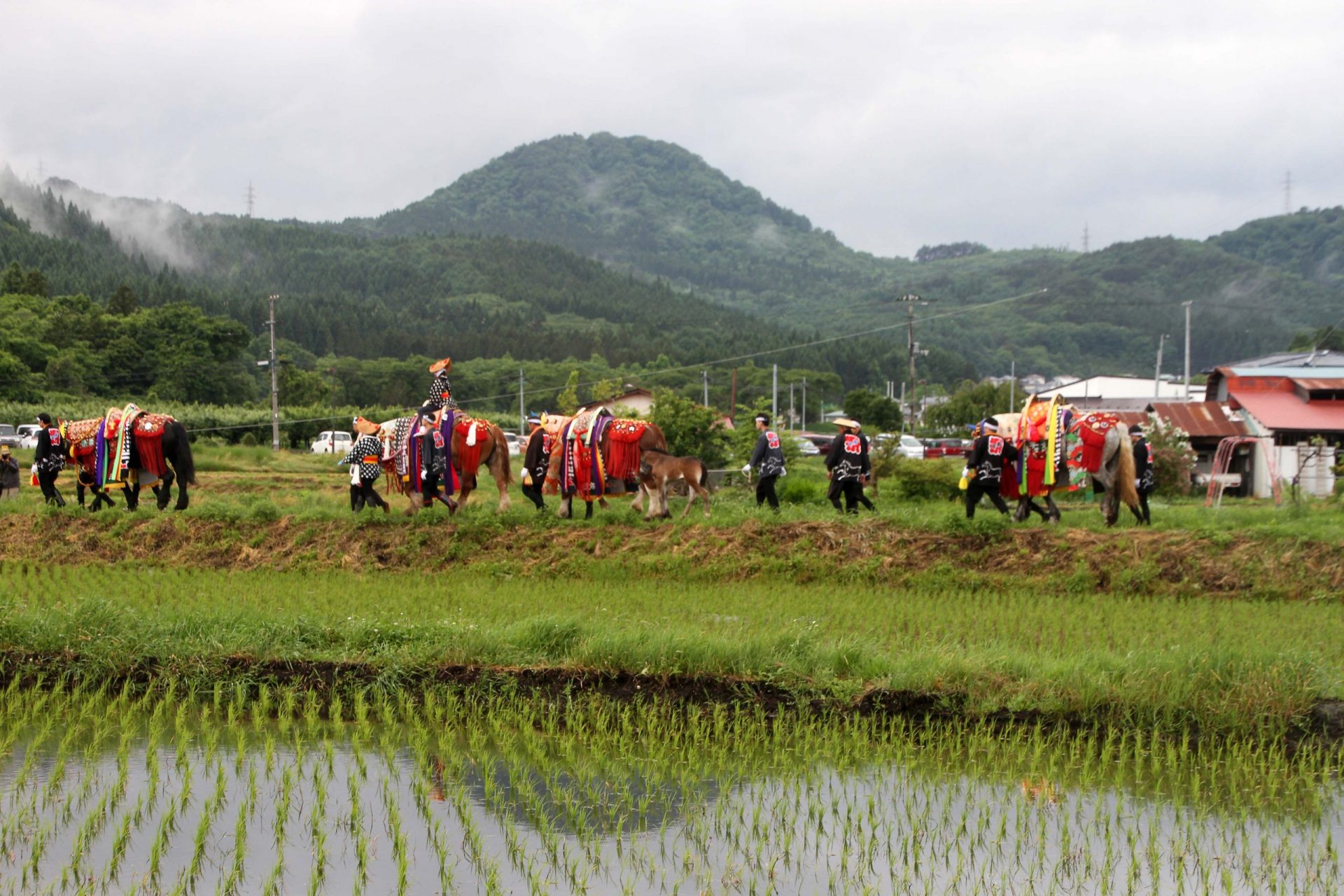 馬装が終わり、お揃いの法被を着たスタッフたちに牽かれていく重種たち。厩舎から鬼越蒼前神社まで田んぼのあぜ道を進む姿はいにしえの風俗を今に伝える。一面に広がる田植え後の田んぼ、華やかな馬の行列、山の緑。絵に描いたような日本の原風景は「映える」ことこの上ない。