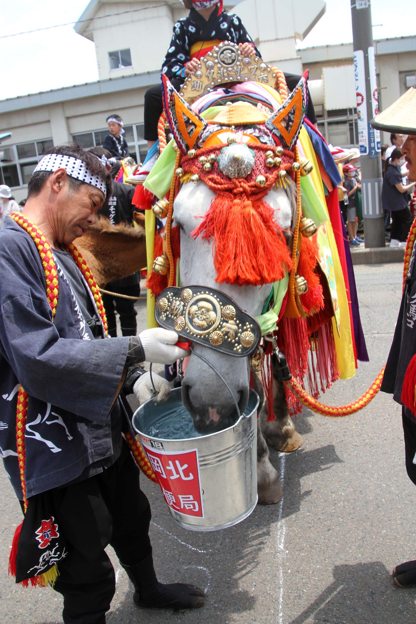 やがて先頭の一団が到着。疲労の色は見えるものの、どの顔も無事に行事を終えた安堵感で笑顔になっている。お参りを済ませたのち、馬装を解き、馬に水を飲ませる。凄まじい勢いでバケツの水がなくなっていく。