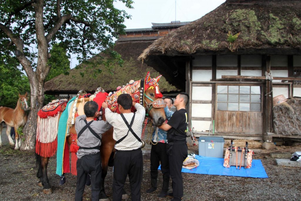 庭先でみんなで馬装。かつては家の習俗として根付いていたはずだ。