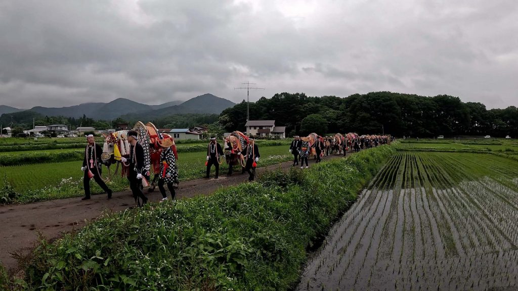 田園地帯を進むチャグチャグ馬コの一行。日本の原風景ともいうべき姿だ。