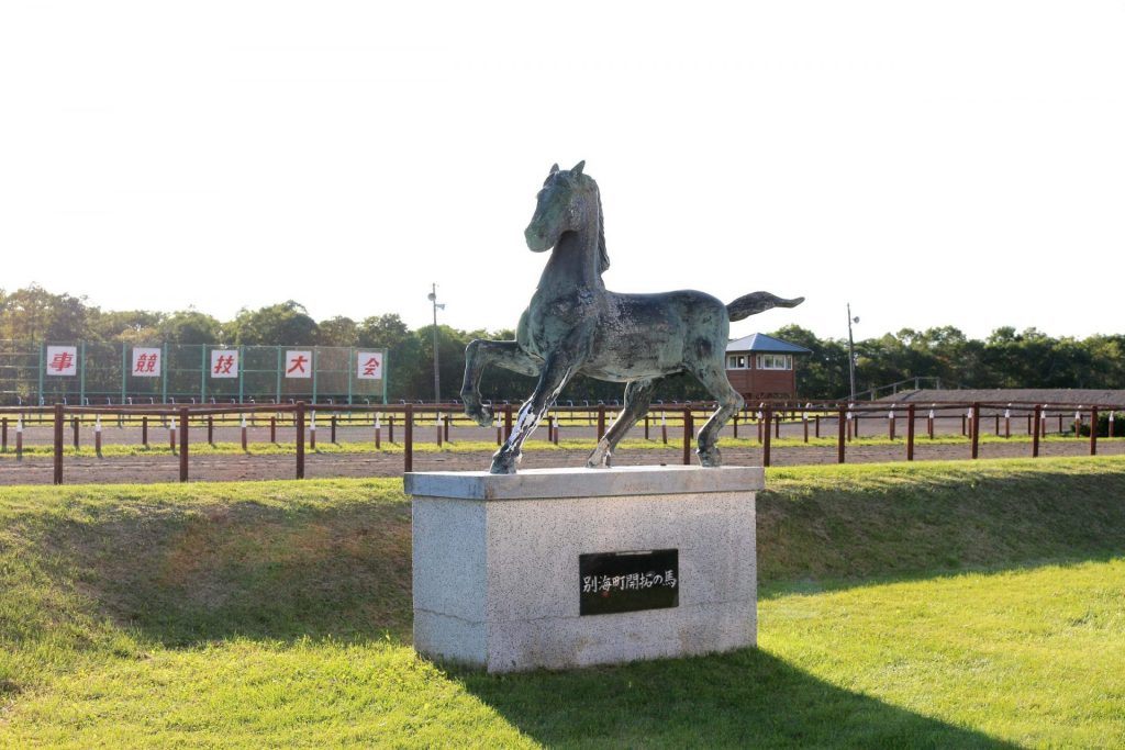 別海競馬場にある「別海町開拓の馬」の像。道東と馬の歴史を記念して建てられた。