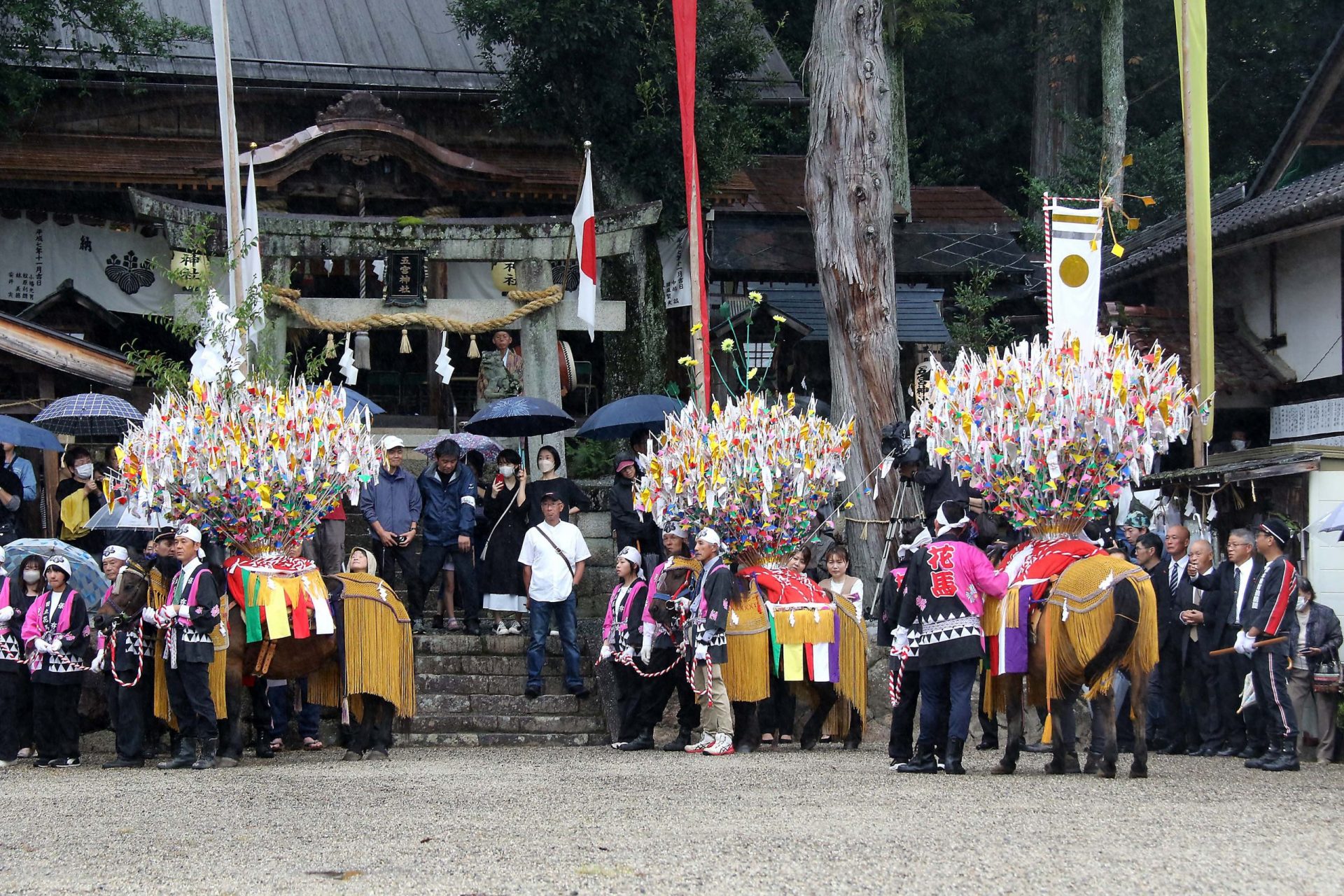 人々が今か今かと待ち受ける中、ようやく行列が境内に入ってきた。花馬3頭が本殿前に進み、祈祷を受ける。