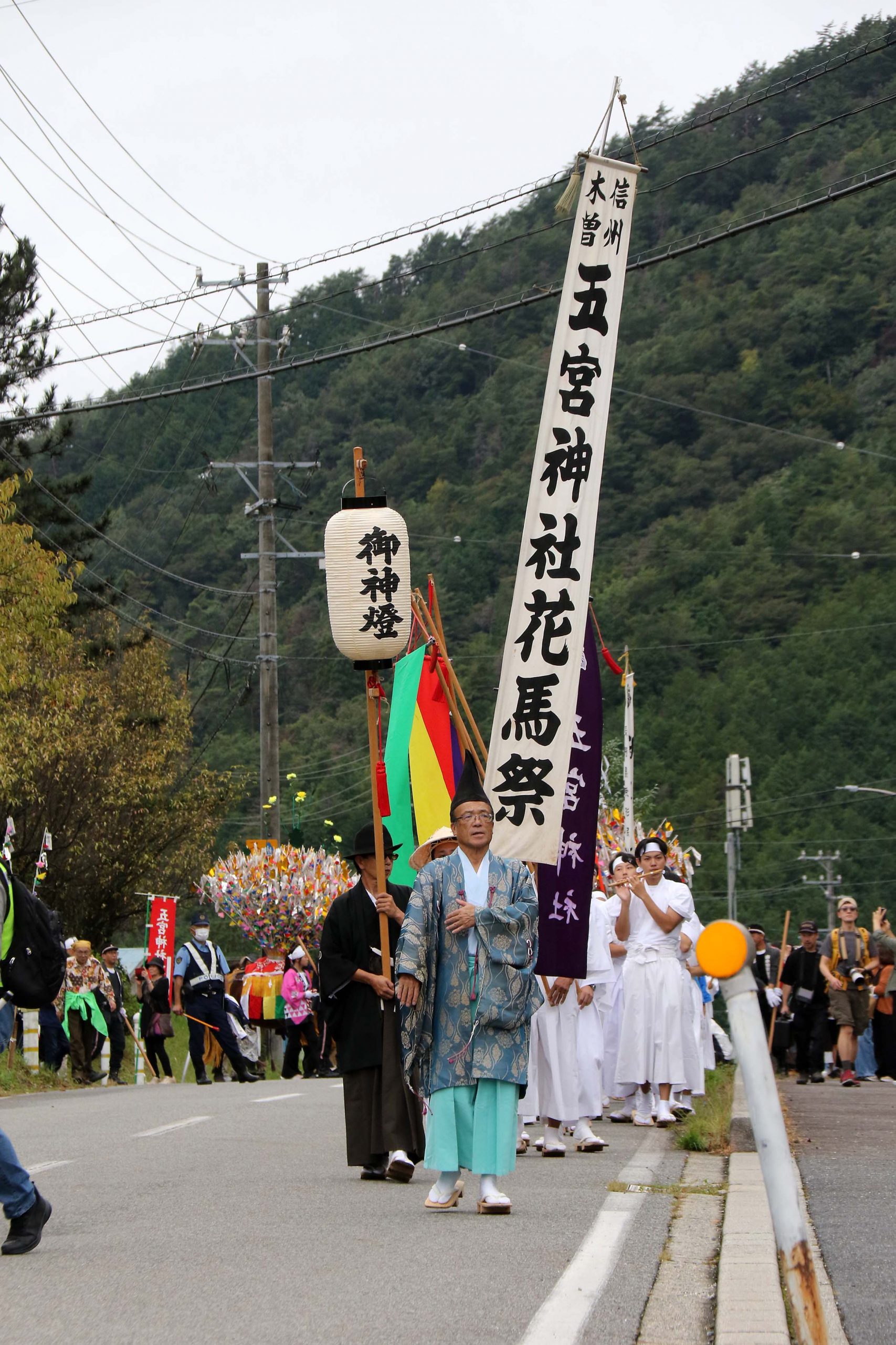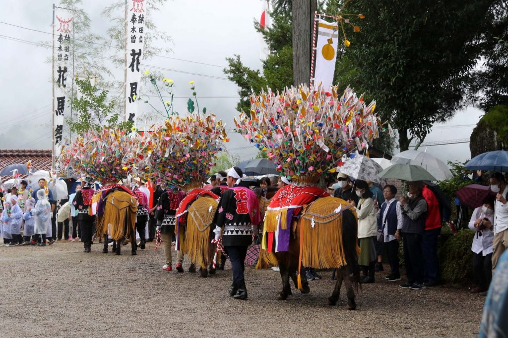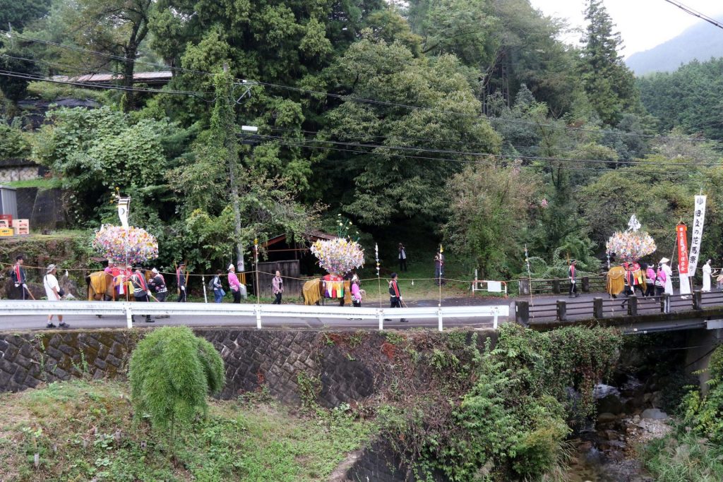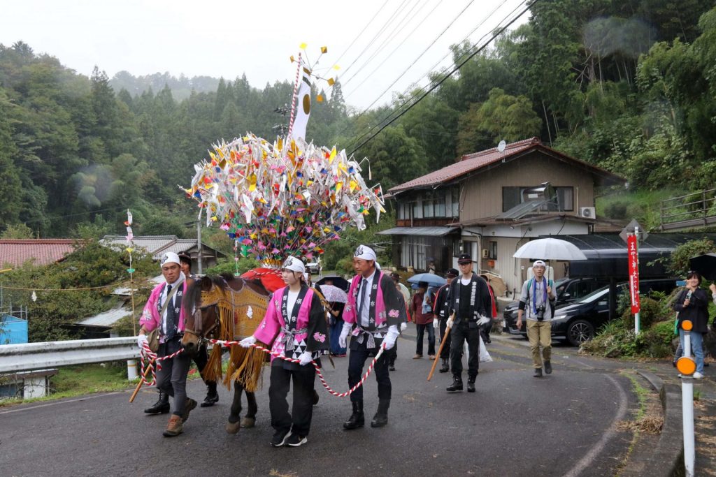 「花」で満たされた鞍を背負った花馬と行列をなす地元の関係者や子供たちがJR田立駅前の広場を出発する。目指すは2km先の五宮(いつみや)神社。お囃子が響く中、独特の歩様で一行はゆっくりと進む。沿道では地元の人たちが行列を見守る。