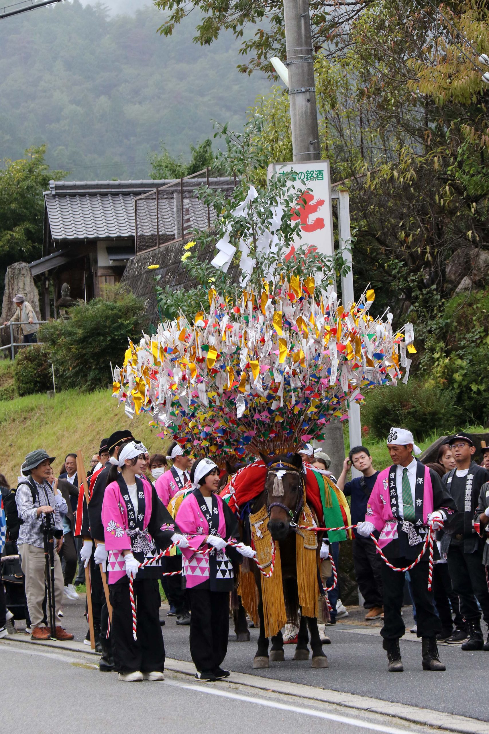 地元の人たちが見守る中、花馬が道路を進む。