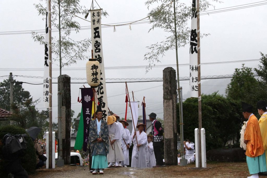途中で休憩を挟み、約1時間後、花馬一行は五宮(いつみや)神社に到着。祭りも後半戦だ。