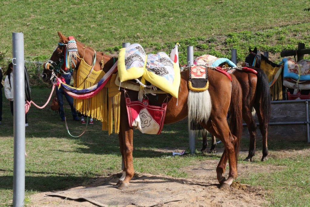 祭用の馬具で装飾されたお供馬。