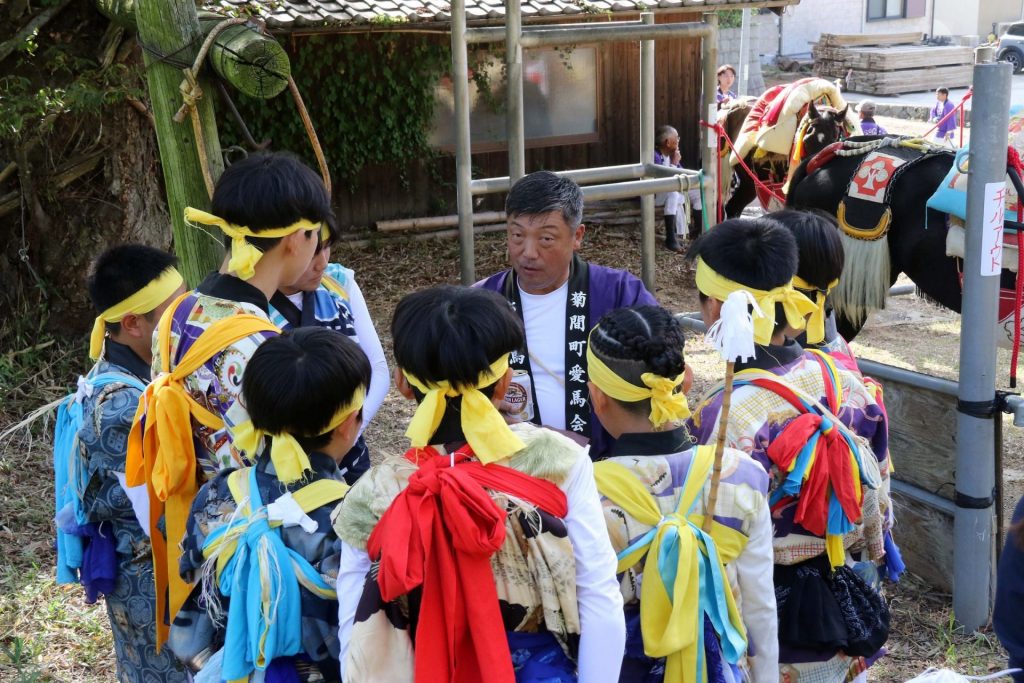 神輿渡御が始まる前、彼らは祭りの衣装に身を包み、同じく祭用の特別な鞍や装飾具で馬装された馬に乗り、境内の参道300mを一気に駆け抜ける祭事を行う。これを「お供馬の走り込み」と呼ぶ。古文書によると1501年には「加茂の馬場」という記述が見られ、境内で行われていたと推測されている。600年以上の伝統がある祭事だ。1965(昭和40)年に愛媛県の無形民俗文化財の指定を受ける。菊間祭の中でも最大のイベントとなっており、何日も前から準備が進められる。